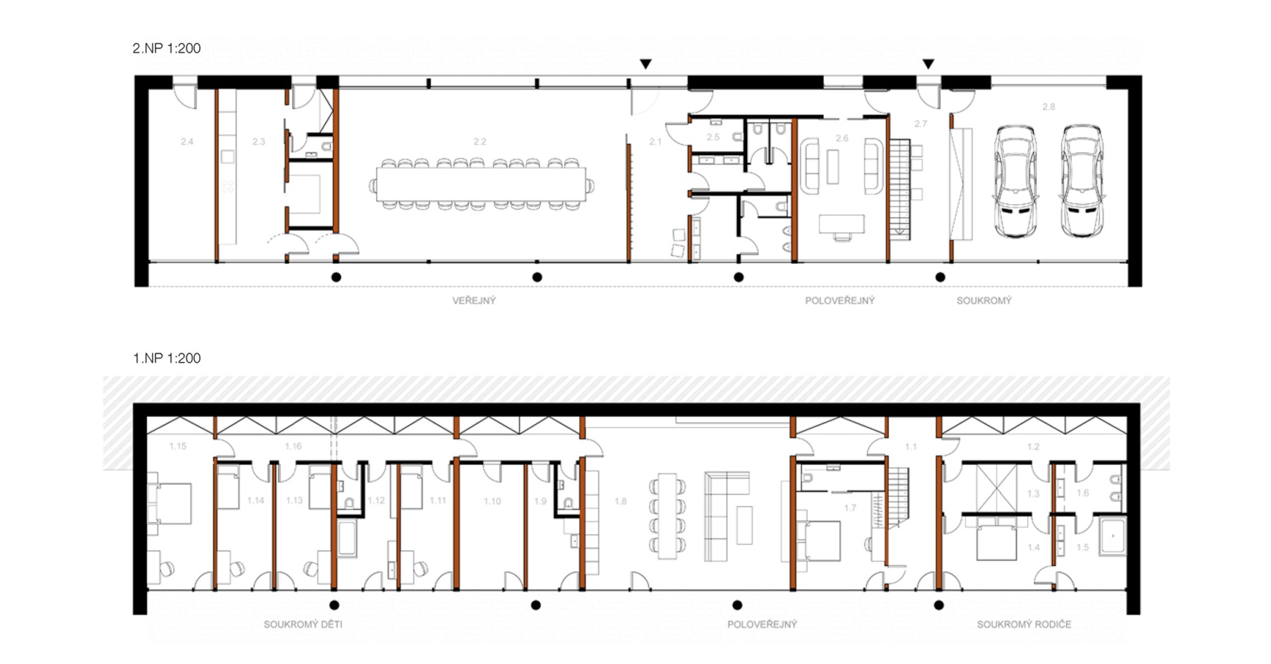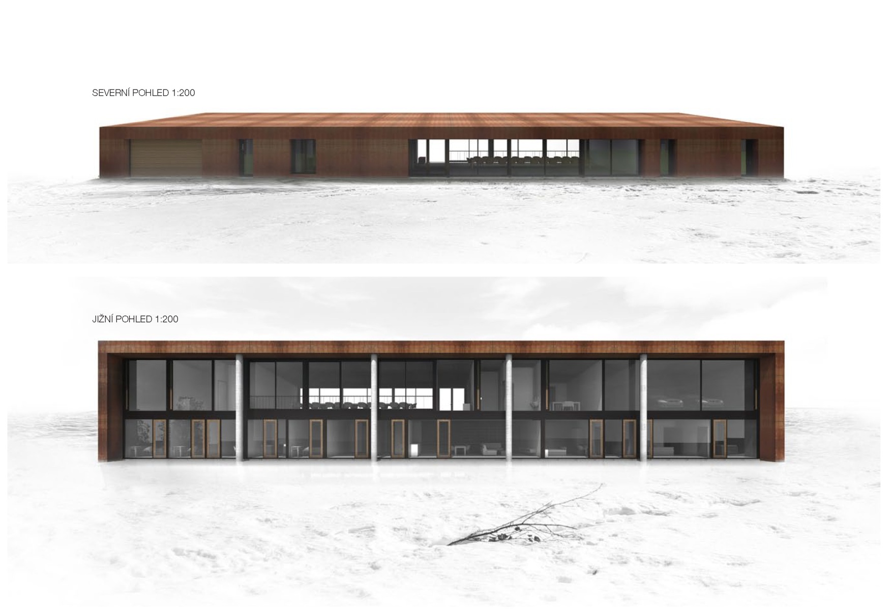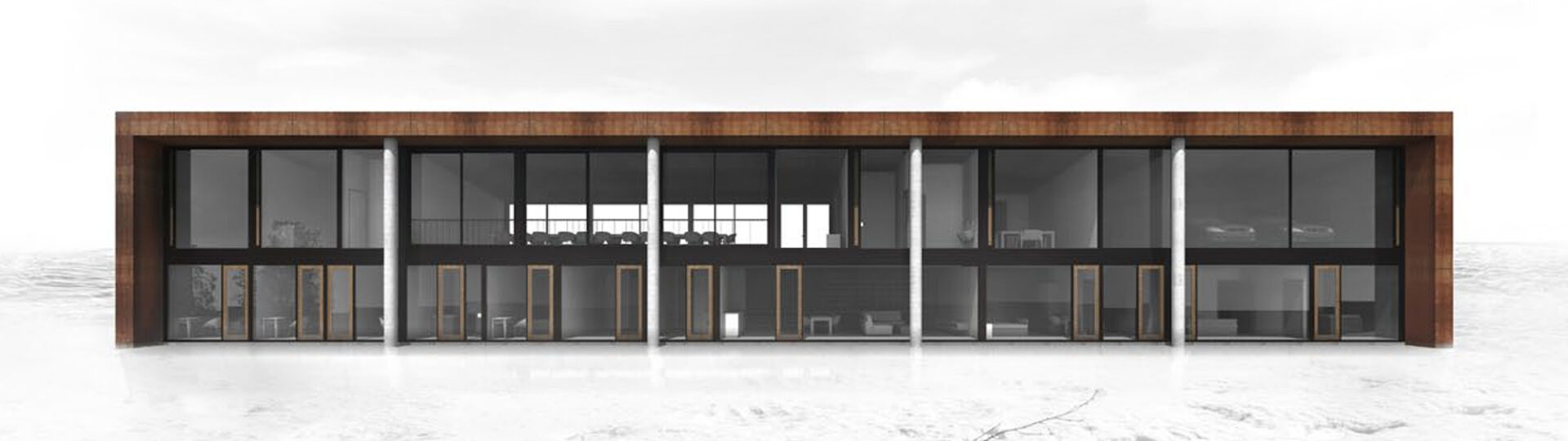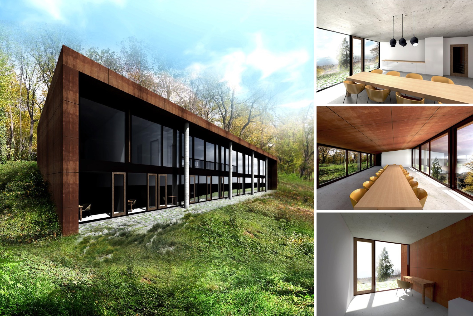 Hanspaulka je charakteristická osazováním solitérů do svažitého terénu. Objekt je solitér, spojený spíše se samotnou parcelou, nežli s okolní zástavbou. Pozemek je natolik soběstačný a charakteristický, že vytváří pro rezidenci zcela vlastní prostředí a atmosféru. Dům je koncipován s ohledem na optimální využití parcely a stávající zeleně. Otevírá se do zahrady směrem na jih, k výhledům na Prahu. Objemově můžeme dům rozdělit do tří částí: 1. – Vnější Cortenová krabice která obklopuje, zastřešuje a chrání celou stavbu. S betonovými sloupy v průčelí vytváří řád. 2. – Horizontlní deska, dělící krabici na dvě podlaží. Reprezentační a soukromé. Rozdělení účelu, funkce i optické. 3. – Lehká membrána tvořena z příček, rámů a zasklení. Ta symbolizuje přírodní nahodilost, obklopenou řádem pro vytvoření harmonie. Toto řešení umožňuje snadnou změnu účelu stavby a změnu dispozic v případě potřeby.