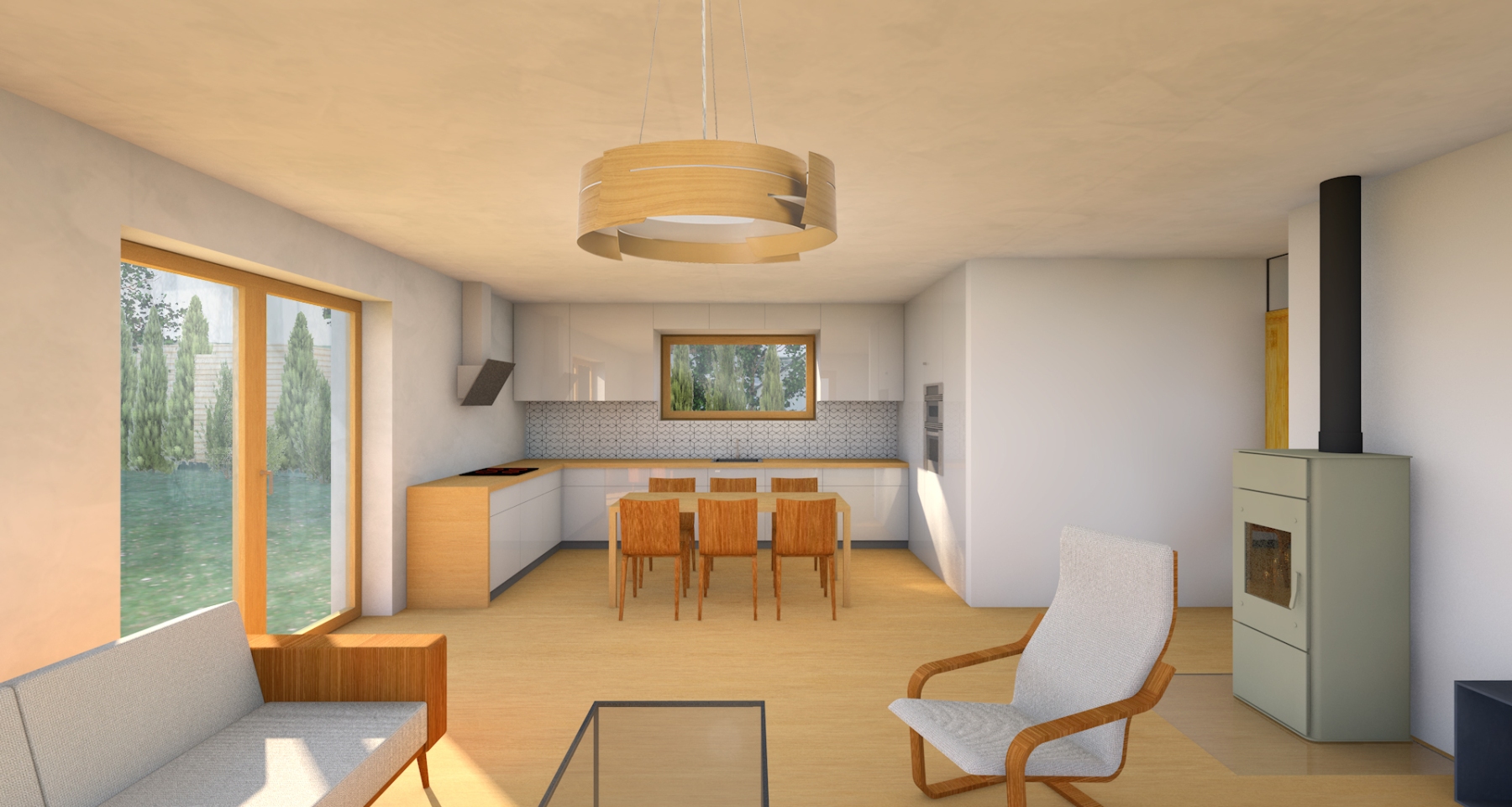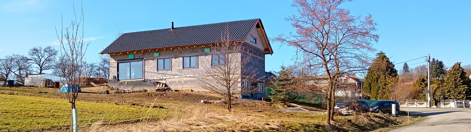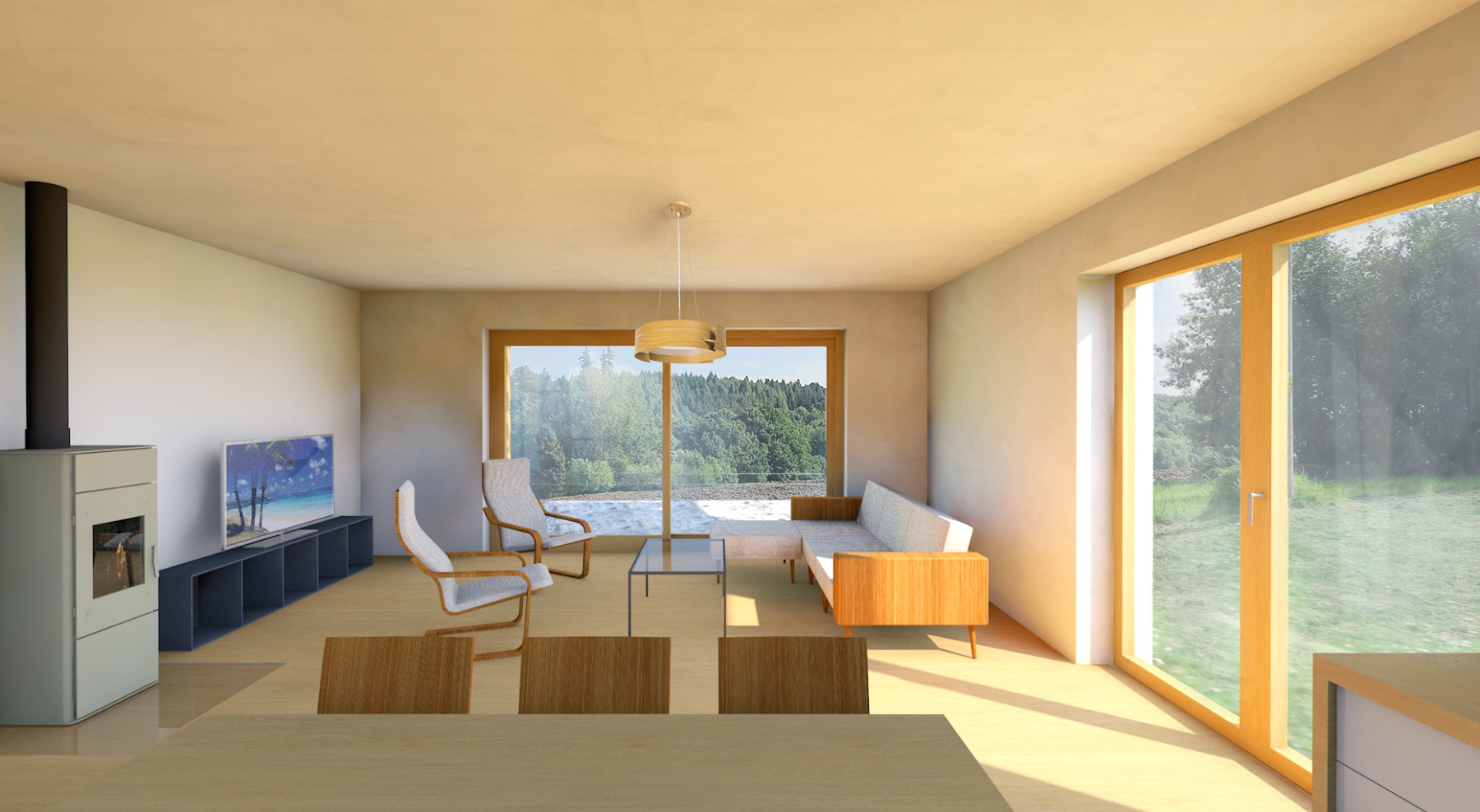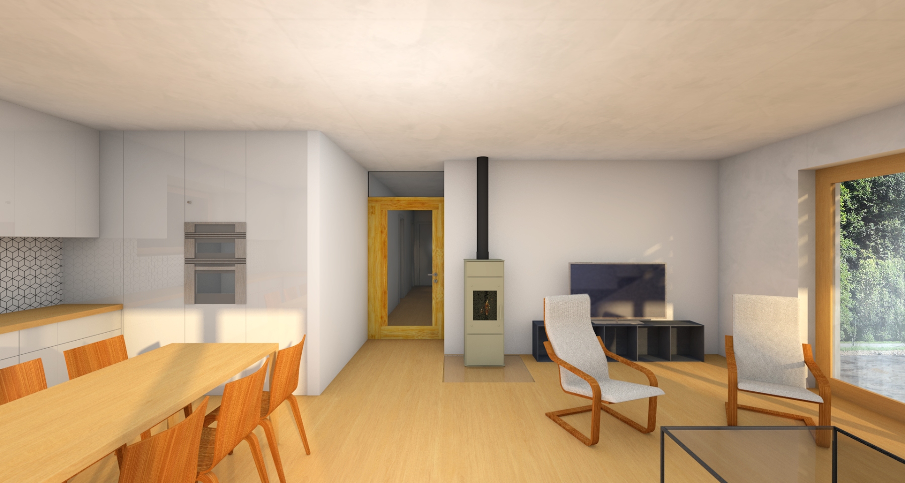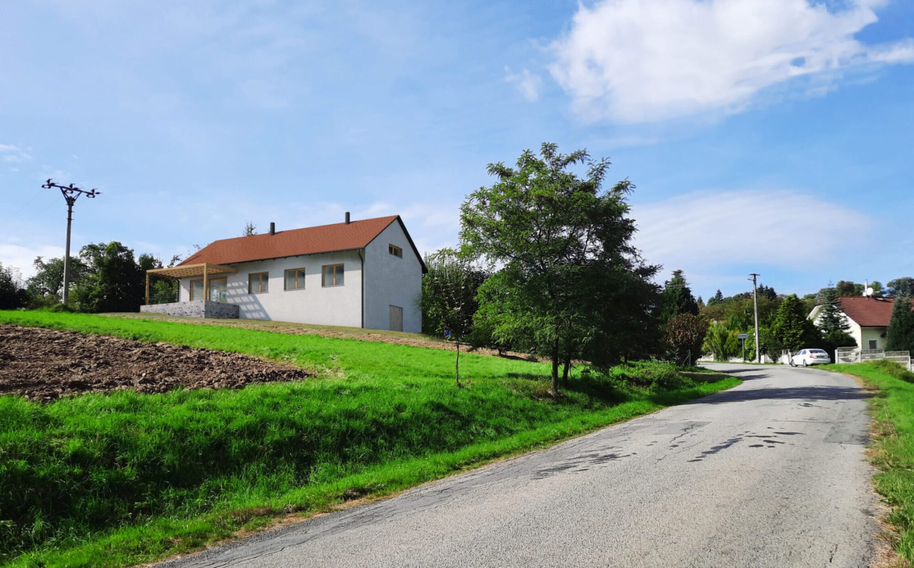 Řešená parcela se nachází v odlehlé a klidné části na kraji obce. Pozemek je úzký pás, svažující se směrem k přístupové komunikaci na severovýchodní straně. Objekt je navržen jako úzký archtypální kvádr se sedlovou střechou, situován štítem k ulici. Zapadá tak urbanisticky i hmotově do okolní struktury obce. Směrem k ulici má vyšší štít se „dvěmi patry“ – v podzemní části domu se nachází sklep a v nadzemním podlaží pak veškeré obytné části domu. Obytné podlaží pak na jihozápadní straně navazuje na úroveň terénu, odkud se dům tváří jako přízemní. Všechny obytné místnoti jsou situovány na jiho-západní stranu kvůli osluněním a výhledům. Na severní stranu jsou situovány veškeré podružné místnosti, koupelna, wc, prádelna atd. Dispozice je navržená jako 4kk, zakončená hlavním obývacím prostorem s kuchyní, situovaným směrem na prosluněný jihozápad a do zahrady v rovnější části pozemku.
